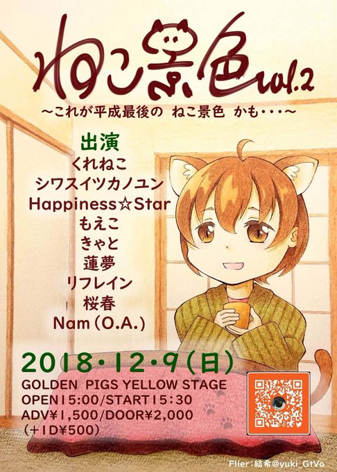明日は我がボスの弟子のくれねこ氏のねこ景色だ!明日は寒く雪が降る予測。しかしそんな雪をライブの暑さで溶かそうじゃないか?とても素敵な豪華出演者多数!みんなで楽しく大いに盛り上がろうぜ!( ´∀` )b