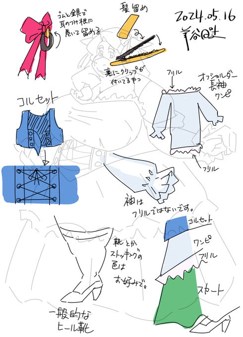 次に描くSkeb絵の衣装ラフ。「こんな感じの衣装で」と提示されたやつそのまま着せただけなので、これはイメージを掴むためのただのらくがきなんですけど。(※実際に着るのは別のキャラクターです) #ひつじのすけぶ