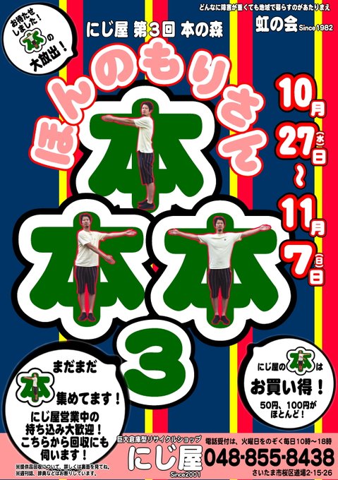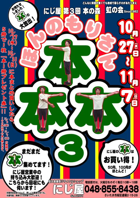 本日ほんのもりさん、最終日です。先週お渡しした本一冊プレゼント券、お持ちの方今日までなのでお忘れなく!どんどん使ってくださいねー。 #nijiya #ほんのもりさん