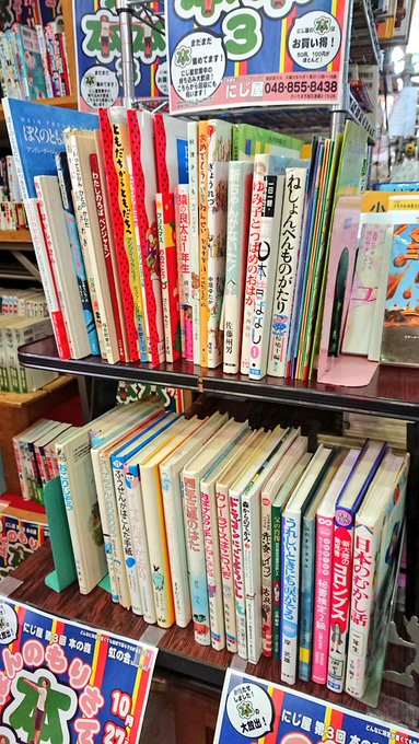 こんな感じであります。 もうはじっこから、上から下まで1冊1冊チェックだ! #nijiya #ほんのもりさん