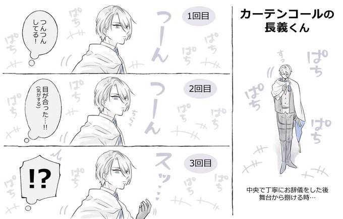 私が「ファンサのフの字の1画目」と呼んでいるステ長義くんの綺伝カテコでのこの動き。全く笑わず、手も振らず。そんな長義くんが氷点下の眼差しとともに見せてくれたほんの一瞬の動き。私の表現力が低くて分かりにくいけど客席を煽るように小指からゆっくりと指を折る仕草。最高でした。