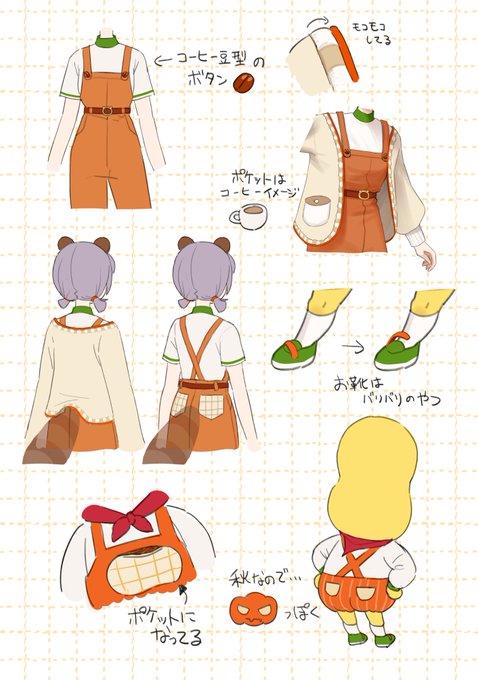 ぽんぽこさんのカフェオレ好き成分を入れたく… アウトドアも楽しめそうなカジュアルさとか秋っぽい色とかで考えてみました! #ぽこピー新衣装