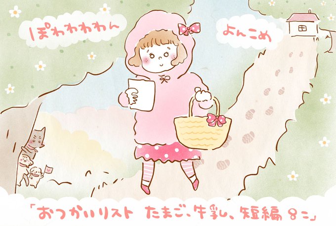 ぽわわわわん よんこめ「おつかいリスト たまご、牛乳、短編8こ」DM郵送ご希望の方は、Twitterメッセージまたはpowawawawan.mail@gmail.comまで、郵便番号・ご住所・お名前をお願いします( ᴗ͈ˬᴗ͈)⁾⁾⁾