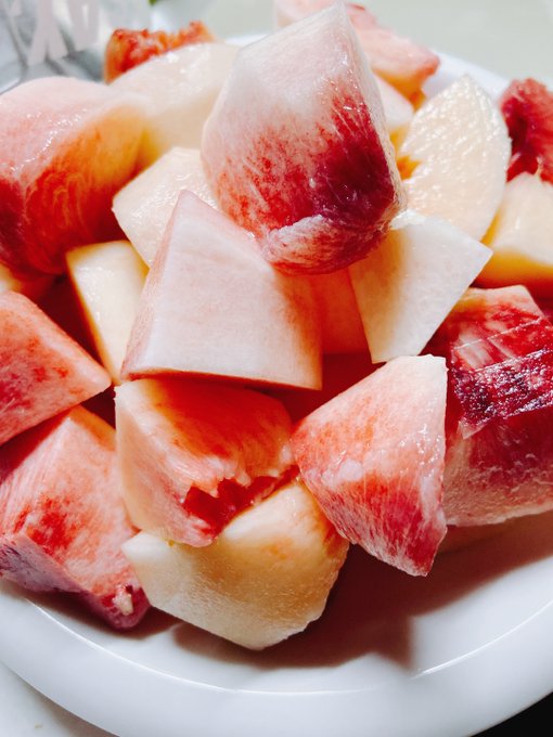 桃モッツァレラ食べたかったの。元祖レシピと言われる内田真美さんのレシピで。水菜の白和えサラダ、味たま、ぼくさんレシピのシンガポークライス(https://t.co/JLYfKEzOfv)、角煮、子ども用に普通の桃 シンガポークライスにはロースが合うって見てバラは角煮に… #みさきちごはん #エオルゼア調理部