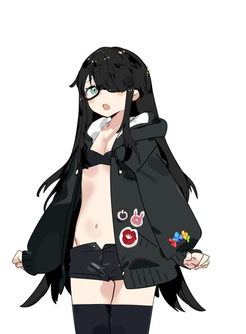 キャラデザを考えつつ立ち絵を作ってる #めたち絵 黒髪ロングは全体的に地味になるので何かくっつけないとなぁ・・・( ᐛ)