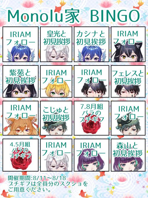 誕生日配信のあとすぐですが こちら本日からです!!!👏 8/18まででちゃんとクリアできるように作らせていただいてますので、ご参加ください!!! スクショ類は全て #ものる家ビンゴ でツイートお願いします🥰👏