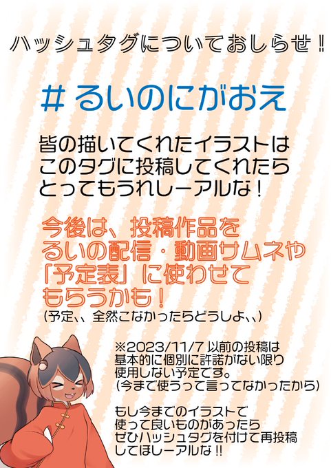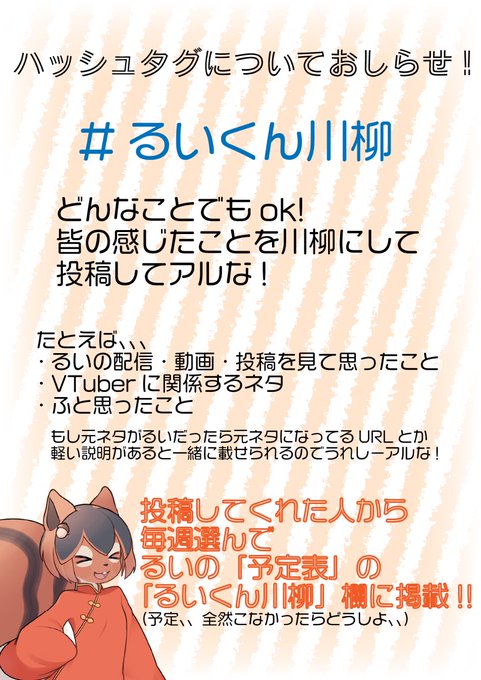 【るいのハッシュタグについて!】 #るいくん川柳 新企画アルよ!!🐿✨ みんな思い思いの川柳を投稿してアルな!!🐿✨ もしかしたら「予定表」の「るいくん川柳」欄に載るかも!🐿✨ #るいのにがおえ 投稿イラストは今後は予定表とかサムネとかに使わせてもらうアルな!🐿✨ 詳しくは画像をちぇっく!🐿✨