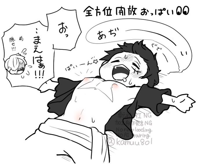 #るひぱい祭り夏の陣 まだまだやるぜπ祭り!!👊 お風呂上がり暑くて前全開でくつろぎ始めちゃう👒さんはいるし、洗い立てつやぷるっπを全力で守ろうとする🕒くんもいる、っていうサンルちゃんです。 🕒「アイス出して来てやるからちゃんと着てろっ💢💢💢」
