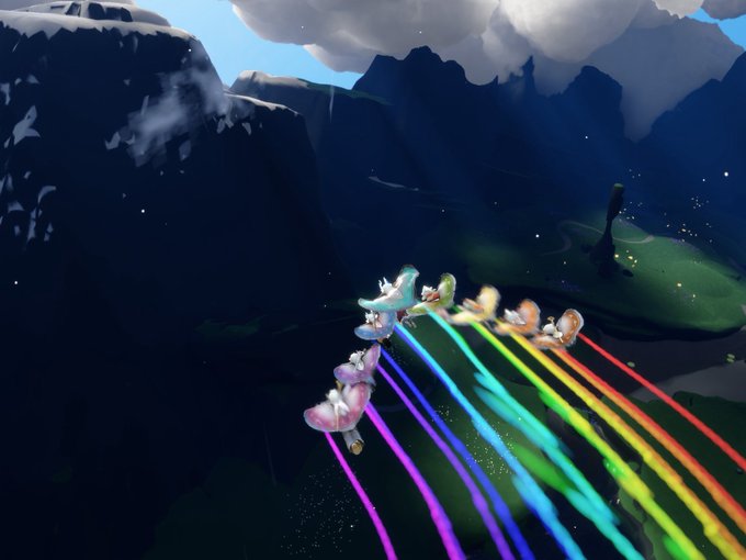 はねあつめしてたら、お久しぶりのみかげさんが遊びに来てくれて、草原連峰に雪を降らせる裏技を見せてくれた☃️❄️️