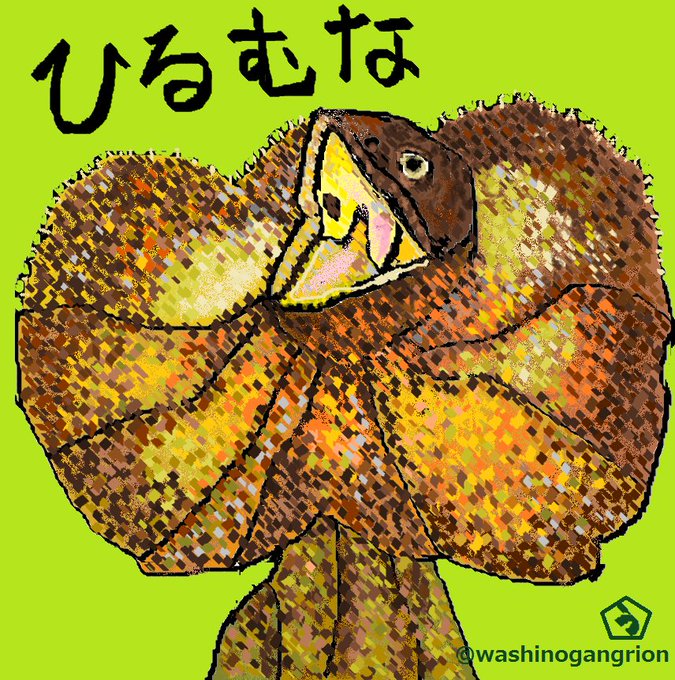 ★お題『ひるむな』 『エリマキトカゲ』 (Chlamydosaurus kingii) 爬虫綱有鱗目アガマ科 危険を察知すると 後ろ足で立ち上がり黄色い口を開け カラフルなプリーツ状のひだを広げて 敵がひるまなければ ひだを開いたまま 安全な木陰に辿り着くまで走り続ける #絵手紙
