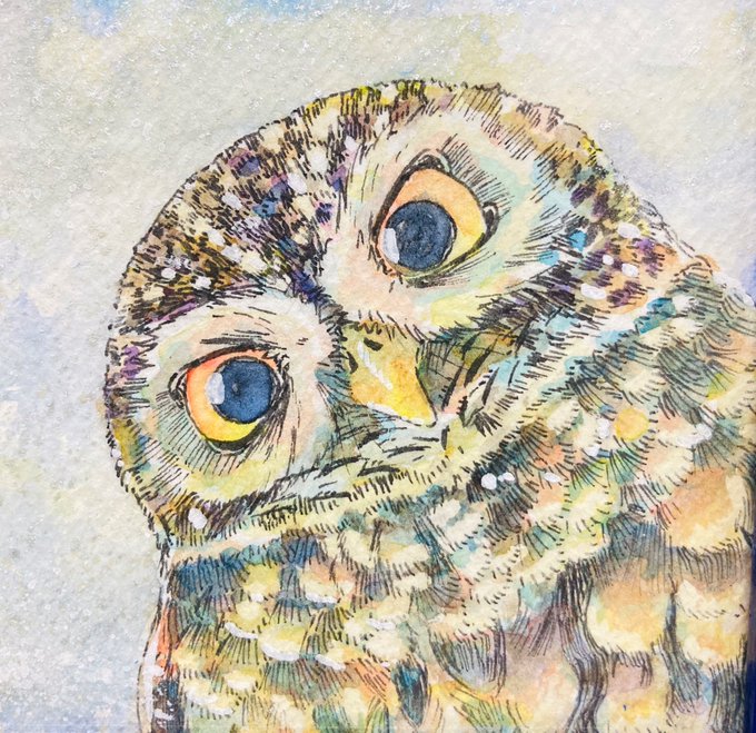 とっても可愛いフクロウちゃんのイラストです🦉羽のふわふわ感、そして美しくて繊細な描き込みと色合いが素敵です✨