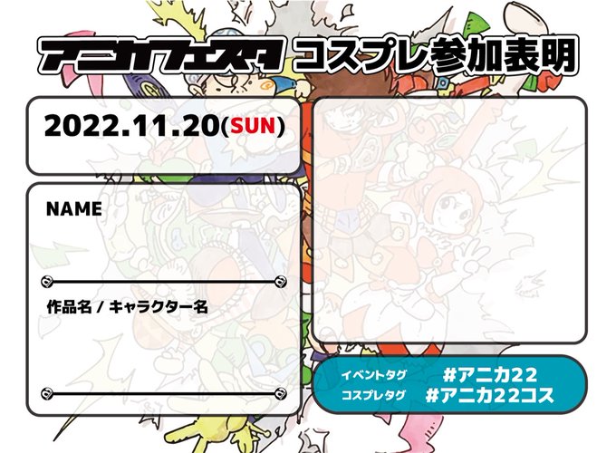 コスプレはぜひ参加表明画像を #アニカ22コス でツイートしてね!コスプレしてる作品がかかりやすくなるかも?!