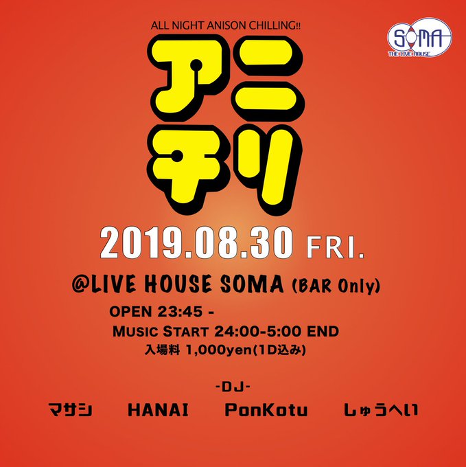 8/30(金)夜 アニチリ @東心斎橋soma