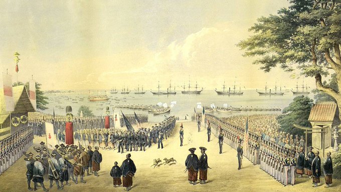 マシュー・ペリー率いるアメリカ海軍所属の東インド艦隊艦船(黒船)4隻が、江戸湾浦賀湾に来航。幕府はペリー一行の久里浜への上陸を認め、そこでアメリカ合衆国大統領国書が幕府に渡され、翌年の日米和親条約締結に至った。この事件から大政奉還までを「幕末」と呼ぶ。