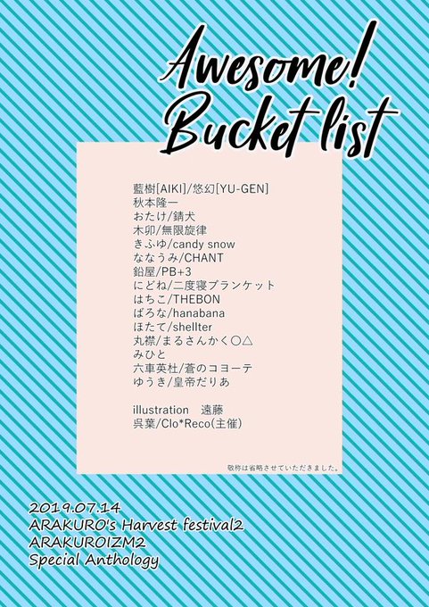 7月14日荒黒の収穫祭2(アラクロイズム2内)で頒布予定の荒黒アンソロジー『Awesome!Bucket list』のサンプルを公開しました。 荒黒作家総勢17名による豪華なアンソロジーです。 西2ホールハ02a「荒黒の収穫祭2本部」にて頒布致します。 どうぞよろしくお願い致します。 https://t.co/gcVzdQsbNk