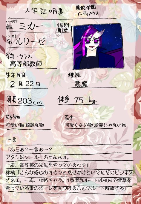 #魔術学園アンティノウス_キャラシ 前の垢は消したから再投稿 高等部の生徒のエリーナ、高等部のオネエ系先生のルーちゃん先生、小等部のモブショタのユキトくんです