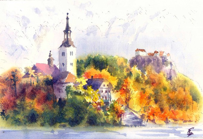 2022年11月6日開催《風景画レッスン》「渋い色味でまとめる 秋のブレッド湖と教会/スロベニア」