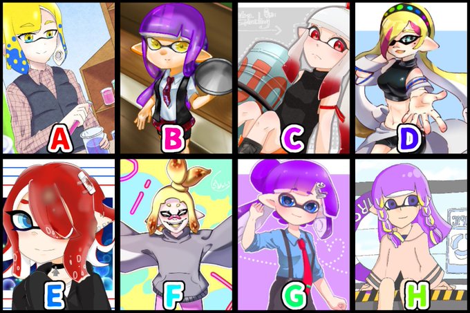 リプライにあるアンケートで、おむしがデザインしたイカタコちゃんどれか回答してほしいです!(A,B,D〜Hのどれかをデザインしました)