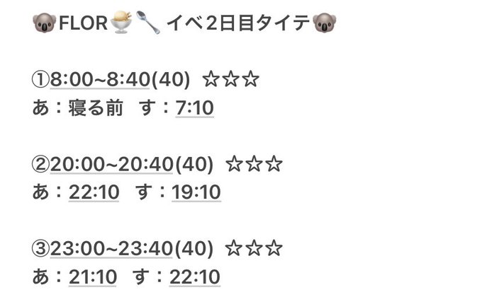 FLORイベ2日目のタイムテーブルです♫