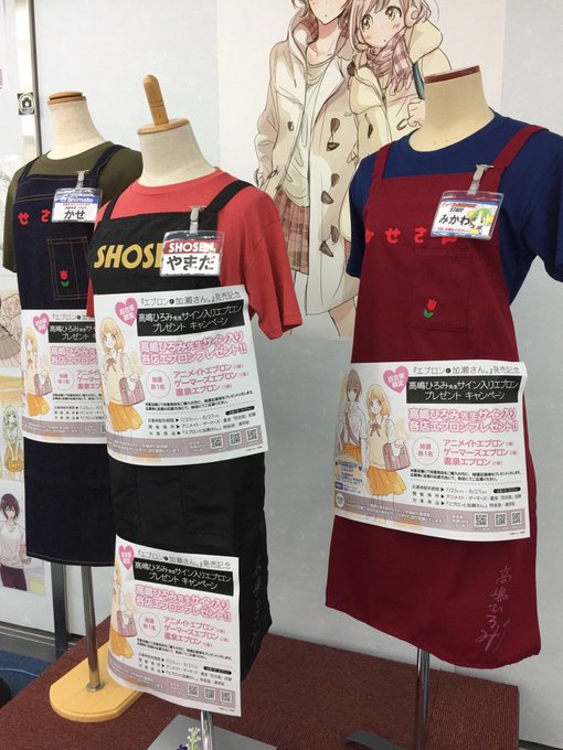 〔9F/ミュージアム〕書泉ブックタワー9Fで開催している「ひらり、ミュージアム」内で『エプロンと加瀬さん。』の発売を記念して、高嶋先生直筆のエプロンが抽選で当たるフェアも同時開催しています!また、『あさがおと加瀬さん。』のアクリルアートスタンドや缶バッチも販売中! #書泉百合部