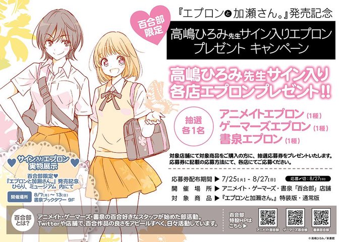 【イベント】高嶋ひろみ先生「エプロンと加瀬さん。」の発売を記念して、書泉ブックタワーにて<百合部限定『エプロンと加瀬さん。』発売記念 ひらり、ミュージアム>の開催が決定しました!開催期間 8月7日(月)~13日(日)詳細はこちら!→https://t.co/H4AaPEODtU