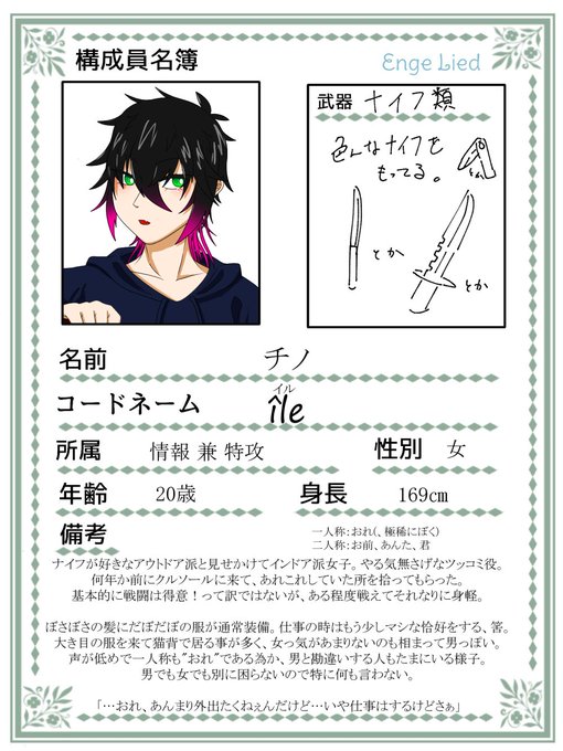 @Crime_Lied_AE エンゲリートの情報兼特攻部隊の構成員、ナイフオタクの女子です。コミュ力はある!よろしくお願いします( 'v')