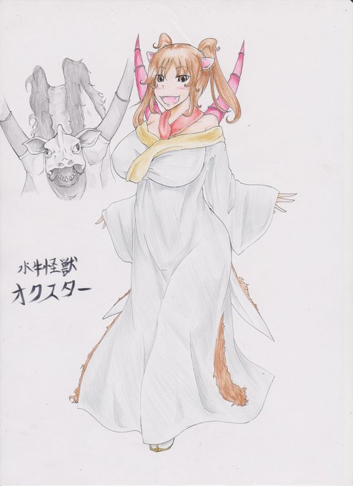 仲間たちの骨を守るため沼に住み着いている怪獣。水がないと力が出ないという設定なので、人魚的な印象も加えつつ、死んだ同族を永久に守り続けようとしたり、沼に人引きずり込んだりなので瞳に狂気も孕んだ感じで。