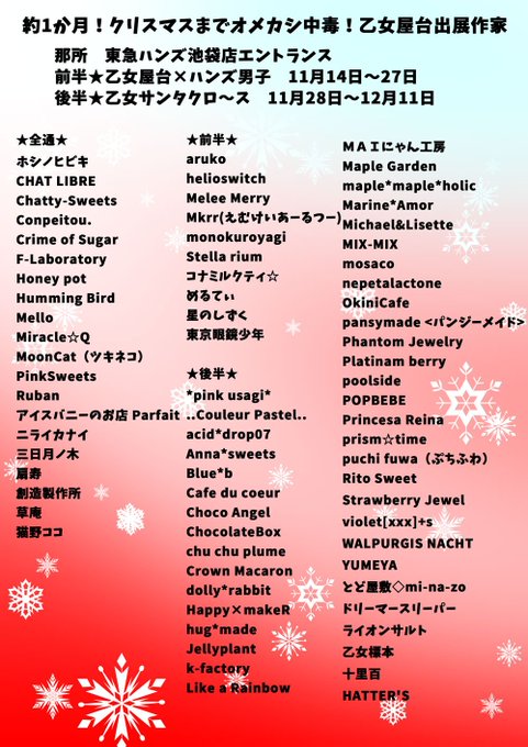 いよいよ!11月14日~約1か月のロング催事始まるよ!!!!#乙女屋台 75名の作家でハンズ男子とのコラボやクリスマス向けアイテム!新作盛りだくさんです!前半後半ともに日々納品が増えていきますのでお見逃しなく!