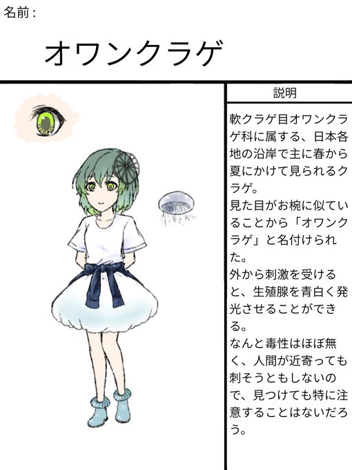 クラゲ詳しくないのに参加してしまったため「クラゲってなんだ…??」て調べて出会ったオワンクラゲがご飯美味しそうに食べる彼女にしかみえなくて原画の通りになりました。某有名人に似ている気がする。 https://t.co/JwUbKKreZI
