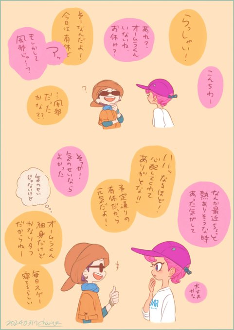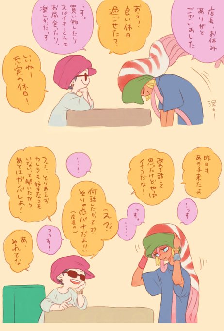 昂るリーゼントちゃんとほんわかするオームラくん&タニシ店長+憤るコジャケ