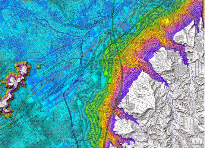 とある番組への協力で図版制作。とある場所のカシミール3D地形図です。段丘面が4段ほどに分類できそうだったのでそれに応じて配色。あとは見た目の気持ちよさですね。
