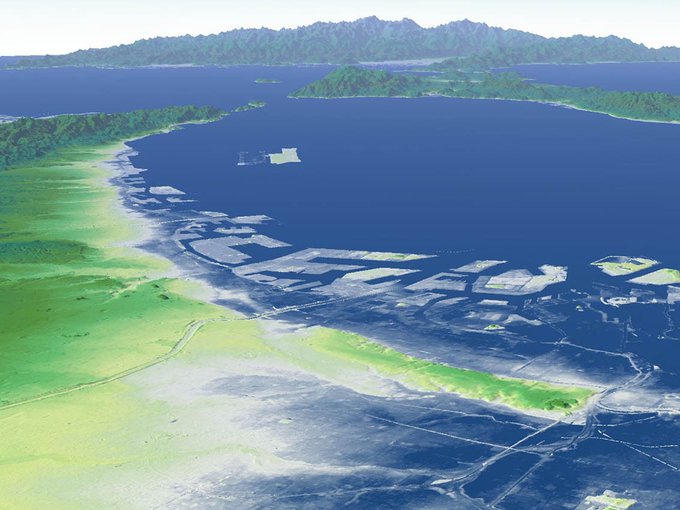 『ブラタモリ・伊豆大島編』かつての火口が地震によって海とつながった伊豆大島南端の波浮港。天然の良港で、近くには浅瀬の漁場があり、多数の風待ちの漁船で賑わった。カシミール3Dスーパー地形セット、GEBCO海底地形データ使用。#ブラタモリ