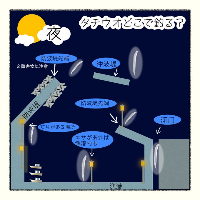 餌はキビナゴ!夜釣りの場所などをイラストもたくさん!楽しめます★