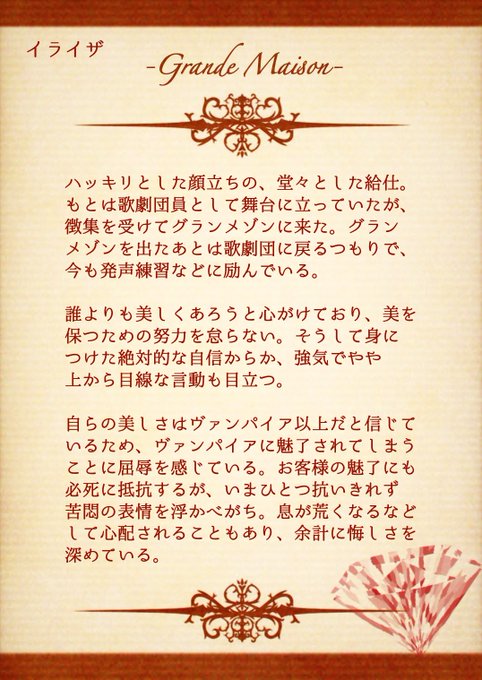 こちら【 @Grande_Maison_ 】に2人目失礼します~~!!!!アンドロギュノスのワガママヴァンパイアです!よろしくお願いします🙇