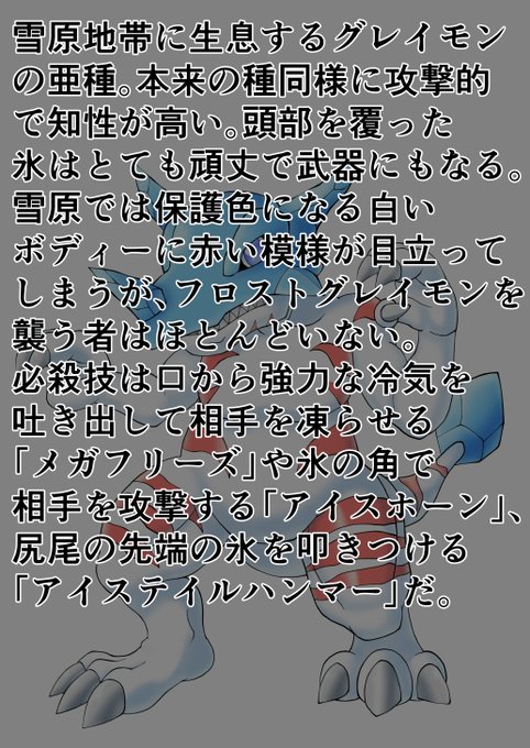 #オリジナルデジモン #オリデジ グレイモンの亜種「フロストグレイモン」。ユキアグモンの進化系をイメージしました。氷の尻尾はグレイモン青の「ブラスターテイル」から着想を得ました。