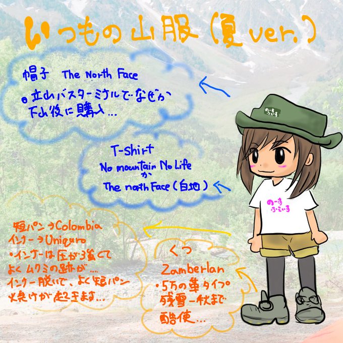 普段の夏場の山装備を落書き。