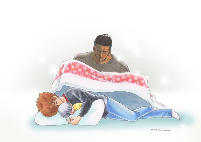クッションに抱き着いて寝ているイワンを抱っこして寝ているジョーにお布団をかけてあげるジェロニモさん、とゆーことで。