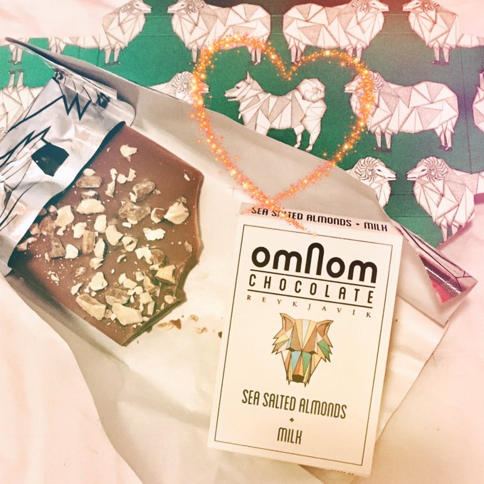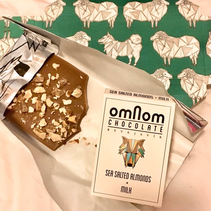 やば!チョコレート美味しくてもう半分食べてしまった!!しょっぱいアーモンドとミルクチョコのバランスがうんま〜い!!巻紙で隠れていた箱の真ん中だけワンちゃんなところもかわいい😍 #サクin氷島2019