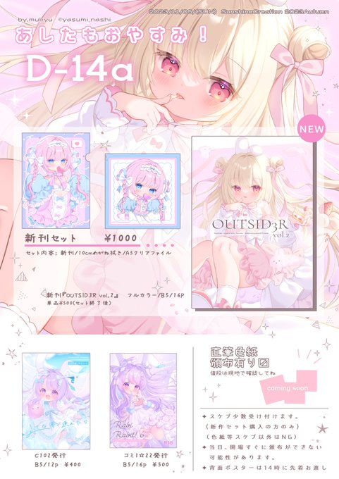 当日到着するのが開場後になる予定ですので頒布時間遅れます!予定なのでどうなるかわからない。前日か当日にはXします!