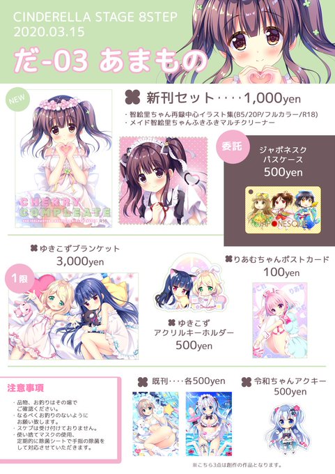 3月15日(日)シンデレラ☆ステージ8STEPの当サークル「宇宙忍者ぞんび」の頒布物のお品書きです。