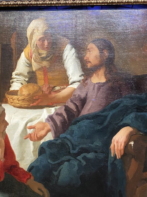 キリストと目線を合せているのが姉マルタ、頬杖をついてキリストの話を聞いているのが妹マリア。働かない妹を叱るように頼むマルタに「神の話を聞くマリアは正しい」と諭すルカ福音書の話。
