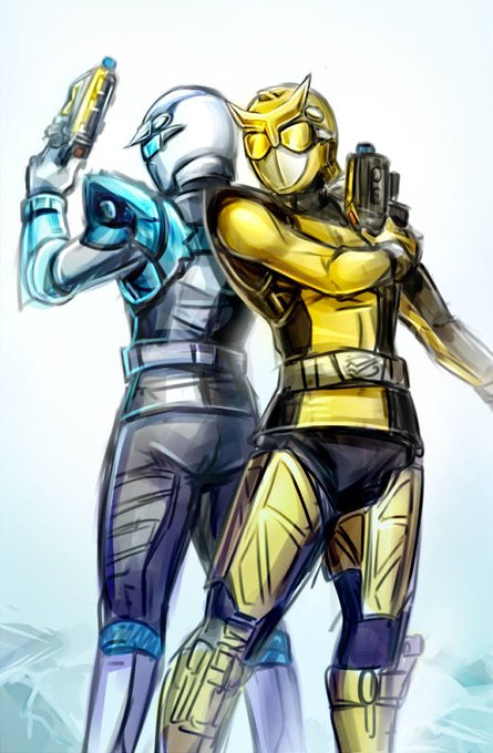 遅刻参加失礼します。 ①「スタッグバスター/ビート・J・スタッグ」 ②「テンビンゴールド/バランス」 ⑤「金と銀」 お題3つ使ってゴーバスターズとキュウレンジャーの金銀コンビで! #特撮版深夜の真剣お絵描き60分一本勝負R