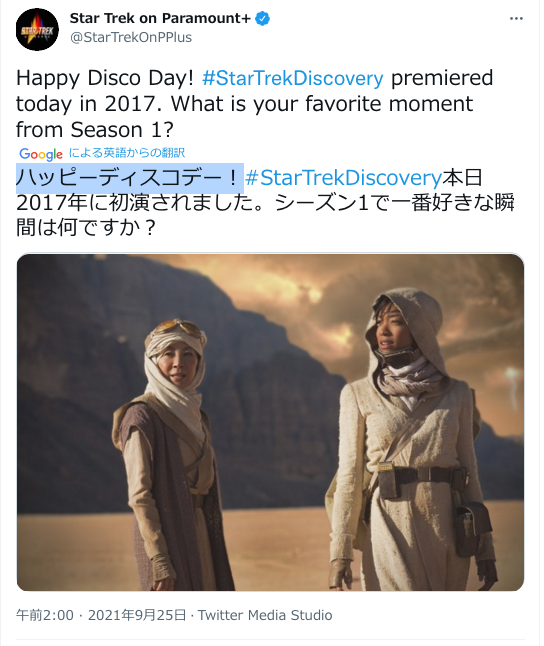 (;´д`;)え!アメリカでは、#StarTrekDiscovery を ディスコって呼ぶの!? マジかいや!!