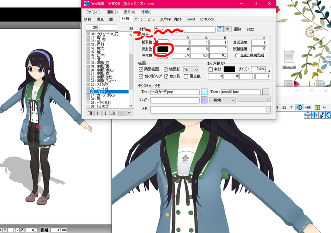 PmxEだと反射色というものに当たるので、そっちに持っていってから修正も可能です!
