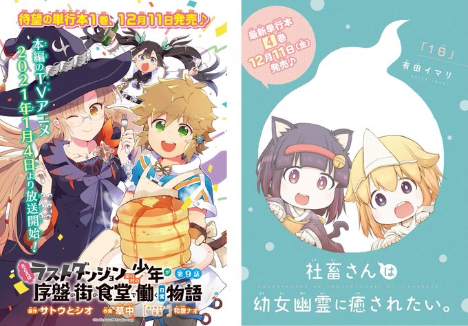 1月号巻中カラーは「女子高生はおはようって言う」「無能なナナ」「裏世界ピクニック」「たとえばラストダンジョン前の村の少年が序盤の街の食堂で働く日常物語」「社畜さんは幼女幽霊に癒されたい。」「スライム転生。大賢者が養女エルフに抱きしめられてます」の6作品!ぜひ確認を☆ #少年ガンガン