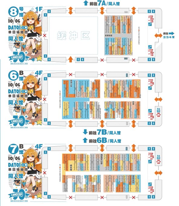 二期の同人館内部のジャンル配置はこんな感じ(①②、CP公式アプリより)。スラダン、呪術、miHoYo、ハイキュー、あんスタなどの島が大きかったです。パンフレット表紙(③)は日本のイラストレーター・米山舞さん。作品の展示ブース(④)もあり、来場者が美麗なイラストに見入っていました。