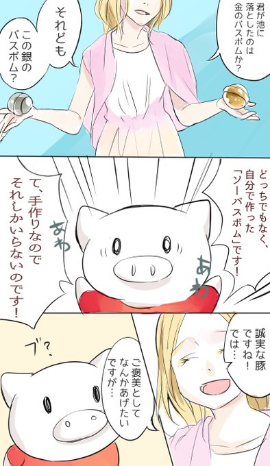 【金の斧、銀の斧】 豚ちゃんの名前は「ブーブー」😉 「ソーバスボムクリスタル」は お水に溶けると水がキラキラになります! https://t.co/ifFLSq44lU #ソーバスボム #バスボム #創作 #漫画 #創作漫画 #創作クラスタさんと繋がりたい