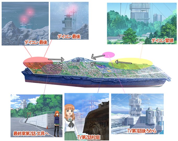 とりあえず学園艦は艦橋と後ろのマストでどの方角からか分かりやすいので、ダイコンは船体後部から始まり、最後は船体前部で終わっているのが分かる。もちろん艦橋が見えるので上甲板の話だな