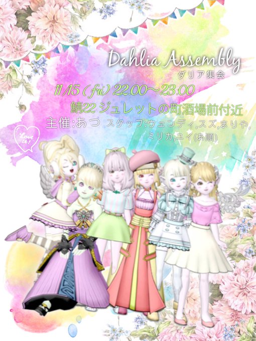 [#拡散希望] こんあつ🙌 今日は #ダリア集会 の詳細解禁です! 日にち👉11/15日金 22時〜23時(居残り24時まで) 場所👉22サバ ジュレットの町酒場前付近 皆さんとお会いできるのスタッフ一同、心より楽しみにしてます😊 詳細は広場見てねー! https://t.co/KWqxg4tLP5