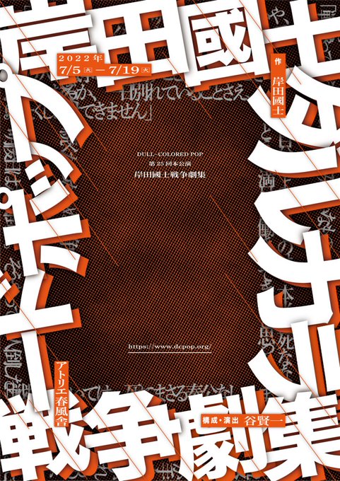 〈声の出演〉で出演します7/5-19DULL-COLORED POP #ダルカラ 第25回本公演『岸田國士戦争劇集』@ アトリエ春風舎、チケット一般発売が開始しております!早速赤組初日(プレビュー公演)が完売とのこと。今回は御予約順の整理番号となるので是非お早めに!https://t.co/aV0ZggJN31